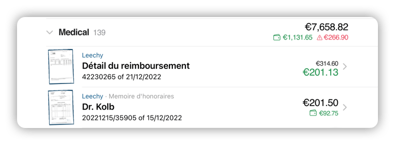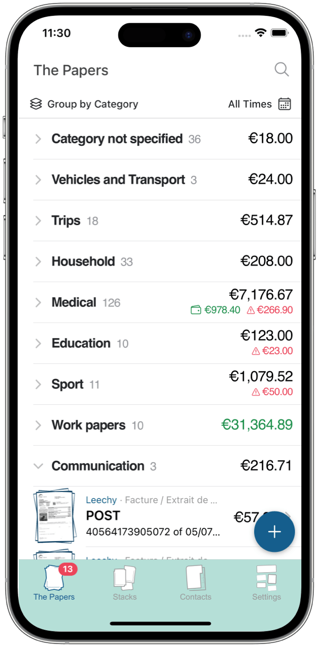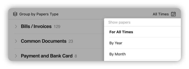 You can see all the papers, and yearly or monthly, group your papers by type, category or contacts. And for each group get more essential totals.